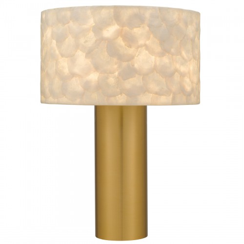 The Leland Table Lamp is a love letter to timeless elegance and coastal serenity. Its cylindrical base, wrapped in brushed gold, rises like a sunbeam—sleek, radiant, and warm to the eye. Topping this golden column is a shade crafted from delicate Capiz shells, each hand-placed to create a shimmering mosaic that dances with the light. As the lamp glows, the translucent shell shade softly diffuses the light, casting a gentle, enchanting glow reminiscent of moonlight on water. Whether perched on a bedside table or gracing a quiet corner, the Leland invites calm, comfort, and a whisper of romance