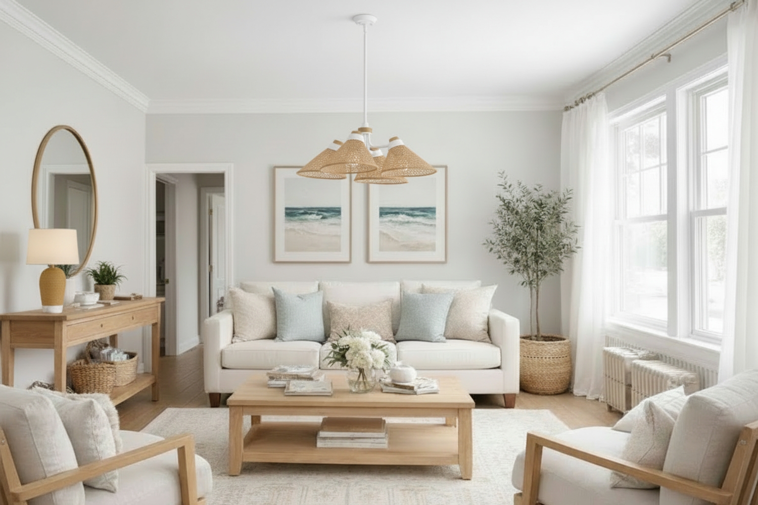 Use natural-material fixtures to define zones. For example, a woven pendant over a kitchen island and a capiz fixture over a dining table create subtle separation while still feeling cohesive. The materials don’t need to match, but they should relate in tone or finish so the space feels intentional rather than disconnected.