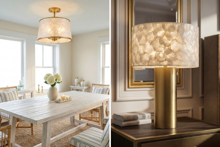 When paired with structured finishes like brushed brass, capiz creates a look that feels both organic and refined.