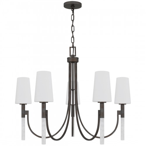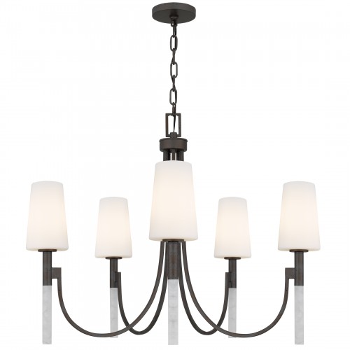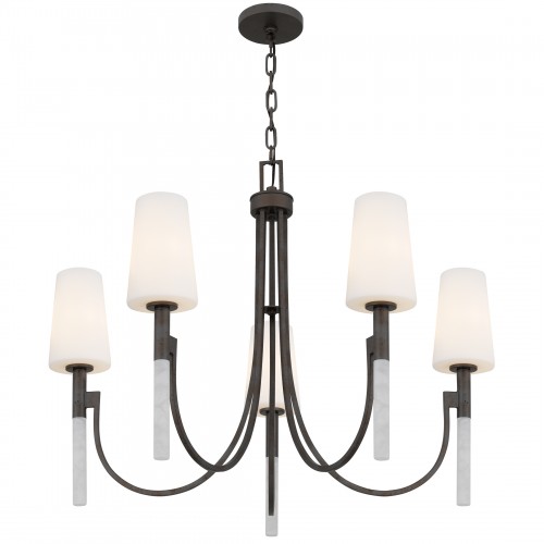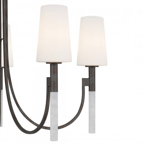 Graceful curves meet sculptural elegance in the Eloura Chandelier, a statement of timeless beauty and modern romance. Finished in a deep iron gate patina, its sweeping arms cradle opal etched glass shades that softly glow like candlelight at dusk. Beneath each light, slender acrylic rods add a delicate shimmer—like dewdrops suspended in air—elevating the chandelier's allure. Eloura brings a poetic presence to dining rooms, foyers, or any space where elegance and warmth are meant to linger.