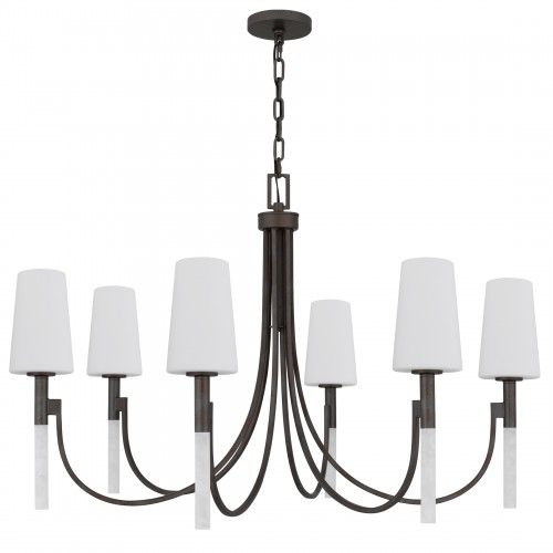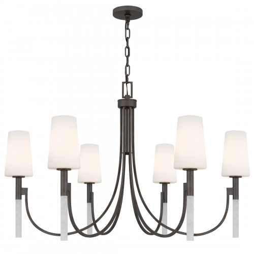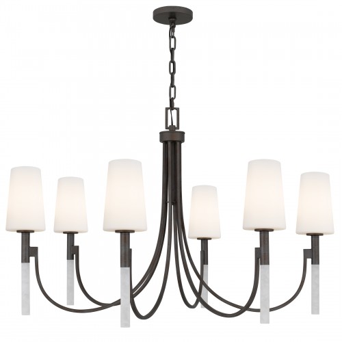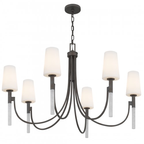 Graceful curves meet sculptural elegance in the Eloura Chandelier, a statement of timeless beauty and modern romance. Finished in a deep iron gate patina, its sweeping arms cradle opal etched glass shades that softly glow like candlelight at dusk. Beneath each light, slender acrylic rods add a delicate shimmer—like dewdrops suspended in air—elevating the chandelier's allure. Eloura brings a poetic presence to dining rooms, foyers, or any space where elegance and warmth are meant to linger.