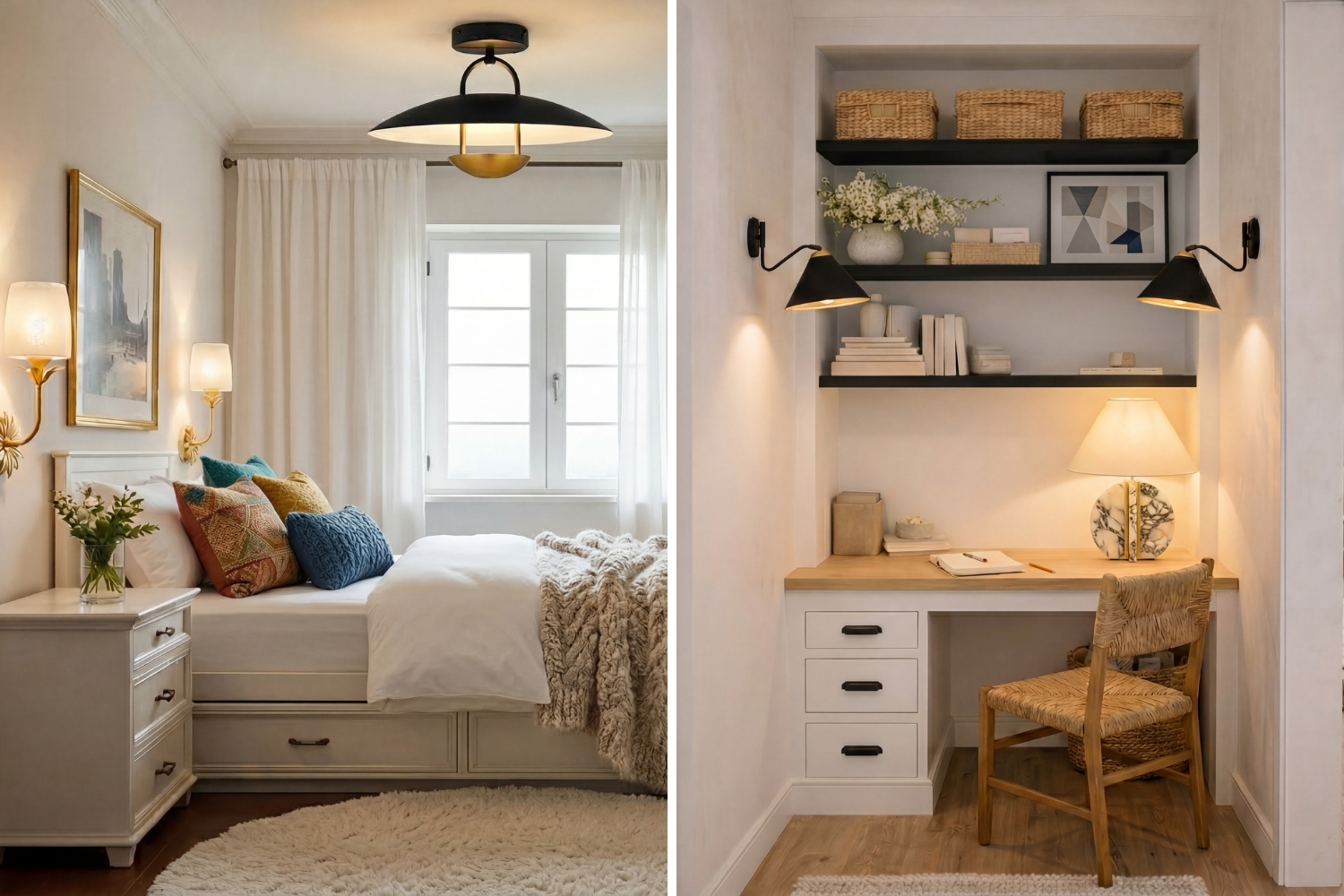 Wall sconces are one of the most effective solutions for small spaces. Mounted directly to the wall, they free up valuable surface space on nightstands, consoles, and side tables.