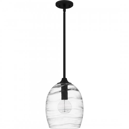 Clear optic glass shades feature a rippling, wave-like pattern that evokes serene movement in the Lucy collection. Clean lines and a matte black finish complete the look, making Lucy a perfect complement to transitional or coastal inspired settings. Lucy is available as a flush mount, pendant light, chandelier, and multiple sizes of bath light.